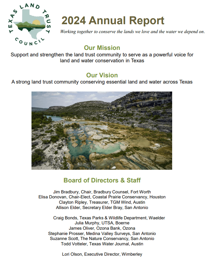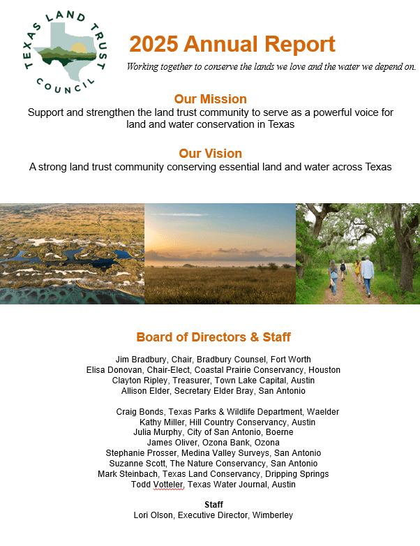 The Texas Land Trust Council supports and strengthens the land trust community to serve as a powerful force for land and water conservation in Texas.